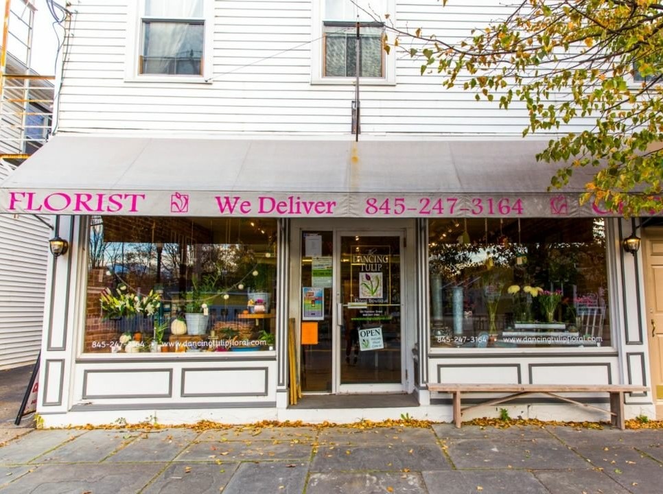 A florist and gift shop in a historic buiding (c 1800s). One of a row of small shops in the Saugerties business area on Partition Street in the Saugerties Village historic district. The lower floor contains the shop which is full of seasonal flowers, gifts, jewelry and the checkout area. There is a large flower cooler and a back room which is used for flower preparation. The floors are wood, the walls are exposed brick, the aesthetic is Hudson Valley meets Brooklyn. Above the shop is an apartment. There is a medium-sized tree outside the shop & a bluestone sidewalk.